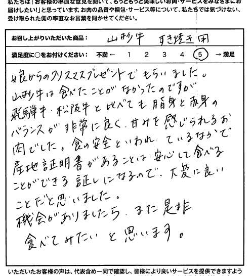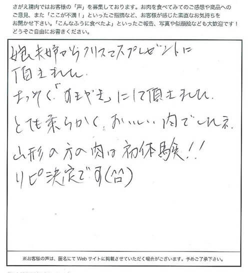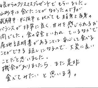 娘からのクリスマスプレゼントでもらいました。山形牛は食べたことがなかったのですが、飛騨牛・松坂牛と比べても脂身と赤身のバランスが非常に良く、甘みを感じられるお肉でした。食の安全といわれているなかで産地証明書があることは安心して食べることができる証しになるので、大変に良いことだと思いました。機会がありましたら、また是非食べてみたいと思います。