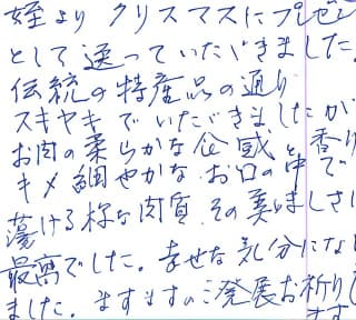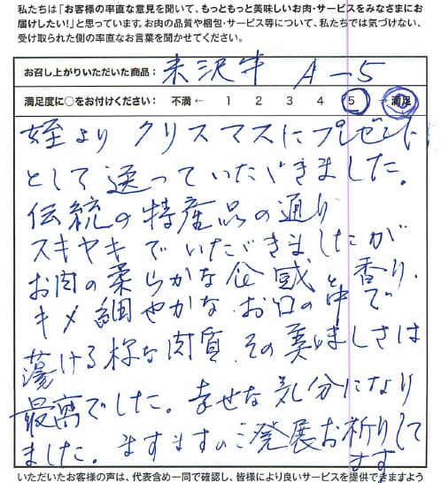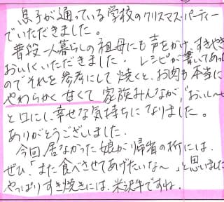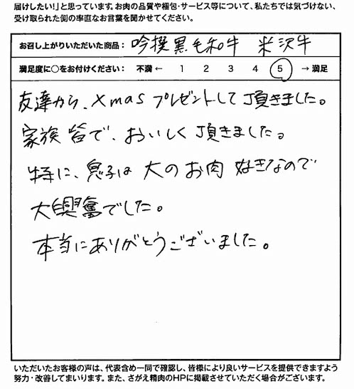 息子が通っている学校のクリスマスパーティでいただきました。 普段一人暮らしの祖母にも声をかけ、すき焼きで美味しくいただきました。 レシピが書いてあったので、それを参考にして焼くと、お肉も本当に柔らかく甘くて、家族みんなが「おいしい〜」と口にし、幸せな気分になりました。 ありがとうございました。 今回居なかった娘が帰省の折には、ぜひ「また食べさせてあげたいな〜」と思いました。 やっぱりすき焼きには米沢牛ですね