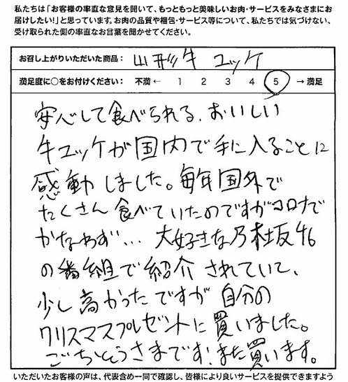 お客さまの声や口コミ・レビューをご紹介いたします。お寄せいただいた温かいお言葉を励みに、もっと、もっと、ご満足いただけるお肉をご提供できるよう努めてまいります。