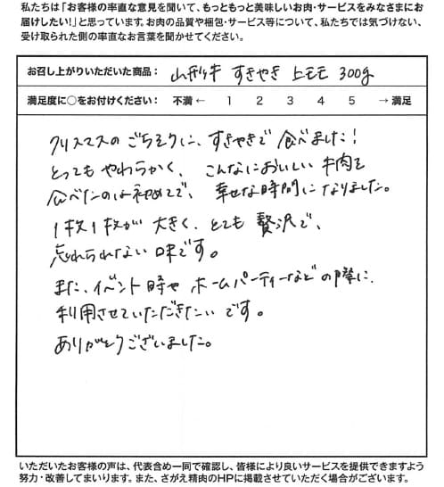 クリスマスのごちそうに、すきやきで食べました! とってもやわらかく、こんなにおいしい牛肉を食べたのは初めてで、幸せな時間になりました。 1枚1枚が大きく、とても贅沢で、忘れられない味です。 また、イベント時やホームパーティーなどの際に利用させていただきたいです。 ありがとうございました。