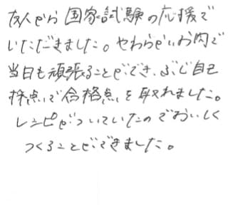 友人から国家試験の応援でいただきました。やわらかいお肉で当日も頑張ることができ、ぶじ自己採点で合格点を取れました。 レシピがついていたのでおいしくつくることができました。