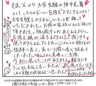 ♡祖父から大学受験の陣中見舞♡としてこちらのおいしいお肉を「スタミナをつけろ!大学受験をのりきれ!」ということで贈っていただきました。お肉は家族でカルビ丼として頂きました。脂と肉汁とがあふれるように、お肉も頬が落ちるようでした♡肉汁を使ってかけられたタレも白いごはんとの相性が抜群に良く、あっという間に食べ終わってしまいました。あんなに美味しいお肉、今までに食べたことがありません。祖父にもたくさんお礼を言いましたが、また食べたいです。これで受験も頑張れる!と思いました。おいしいお肉をありがとうございました♡