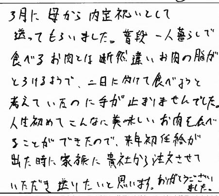 3月に母から内定祝いとして送ってもらいました。普段一人暮らしで食べるお肉とは断然違いお肉の脂がとろけるようで、二日に分けて食べようと考えていたのに手が止まりませんでした。人生初めてこんなに美味しいお肉を食べることができたので、来年初任給が出た時に家族に貴社から注文させていただき送りたいとと思います。ありがとうございました。