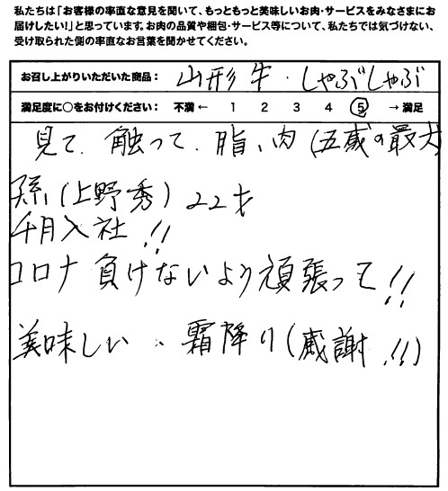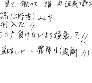 見て、触って、脂、肉(五感の最大)孫22才 4月入社!コロナ負けないよう頑張って!!美味しい、霜降り(感謝!!)