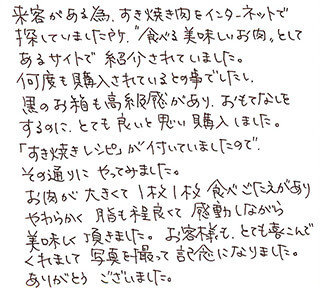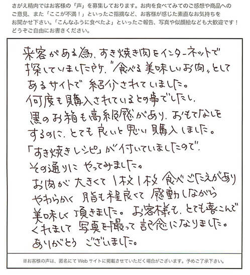 来客がある為、すき焼き肉をインターネットで探していました所、“食べる美味しいお肉”としてあるサイトで紹介されていました。何度も購入されているとの事でしたし、黒のお箱も高級感があり、おもてなしをするのに、とても良いと思い購入しました。「すき焼きレシピ」が付いていましたので、その通りにやってみました。お肉が大きくて1枚1枚食べごたえがあり柔らかく脂も程良くて感動しながら美味しく頂きました。お客様も、とても喜んでくれまして写真を撮って記念になりました。ありがとうございました。