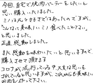 今回、自宅で焼肉パーティーをしたいと思い購入いたしました。 ミノはもともと好きではあったのですが、「こんなに美味しいミノ食べたことない」と思いました。 正直感動しました。 また感動を味わいたいと思いますので、購入させていただきます。 コロナが流行っている中、大変な思いをされていると思いますが、これからも美味しいお肉を作ってください。