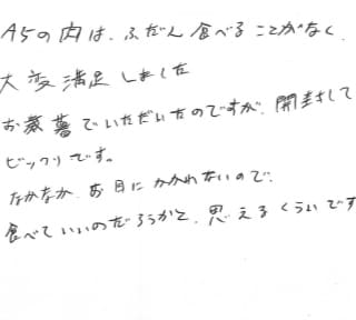 お客さまの声や口コミ・レビューをご紹介いたします。お寄せいただいた温かいお言葉を励みに、もっと、もっと、ご満足いただけるお肉をご提供できるよう努めてまいります。