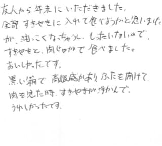 友人から年末にいただきました。 全部すきやきに入れて食べようかと思いましたが、油っこくなっちゃうし、もったいないので、すきやきと、肉じゃがで食べました。 おいしかったです。 黒い箱で高級感があり、ふたを開けて、肉を見た時、すきやきが浮かんで、うれしかったです。