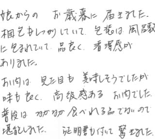 娘からのお歳暮に届きました。梱包もしっかりしていて、包装は風呂敷に包まれていて、品良く、清潔感がありました。 お肉は、見た目も美味しそうでしたが味もよく、高級感あるお肉でした。普段はなかなか食べれる品でないので堪能しました。証明書もついて驚きました。