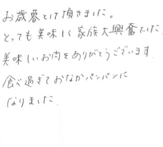 お歳暮として頂きました。 とっても美味しく家族大興奮でした。美味しいお肉をありがとうございます。 食べ過ぎておなかパンパンになりました。