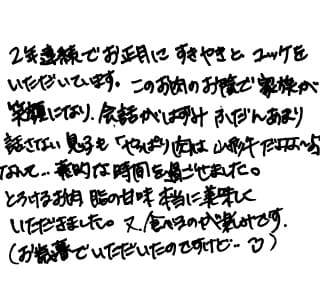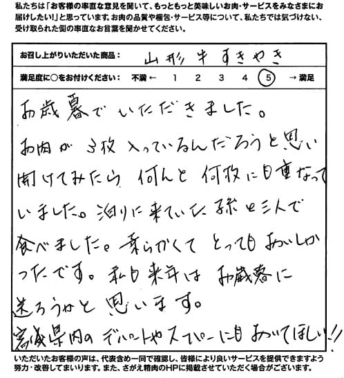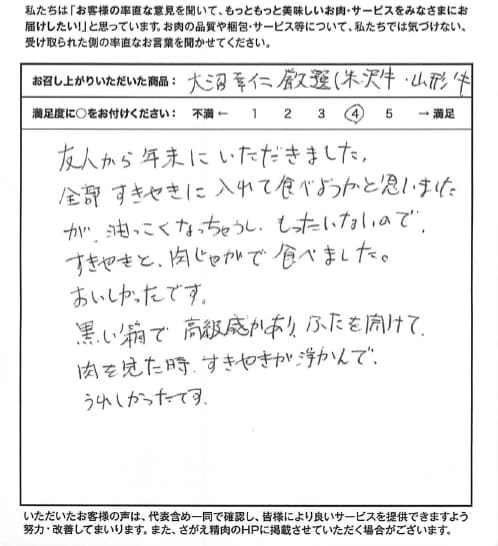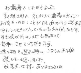 お歳暮でいただきました。 すき焼き用で、久しぶりに最高のおいしいお肉をいただくことができ、ありがとうございました。中にレシピが入っていたのもうれしかったです。 すき焼き以外のレシピもあったので参考にさせていただきます。 送り物を選ぶ時に、こちらのお肉を選びたいと思いました。 改善点は特にありませんでした。