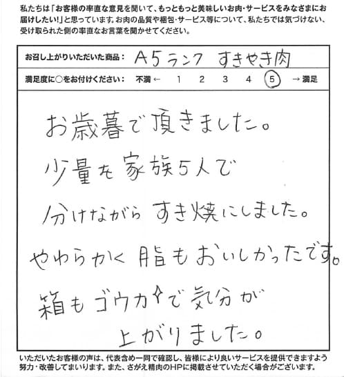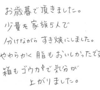 お歳暮で頂きました。 少量を家族5人で分けながらすき焼きにしました。 やわらかく脂もおいしかったです。 箱もゴウカで気分が上がりました。