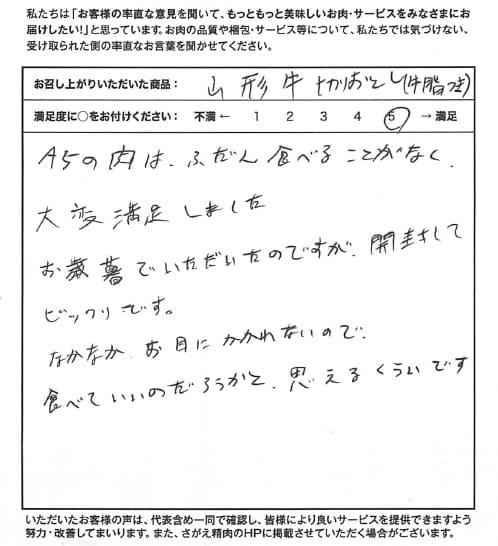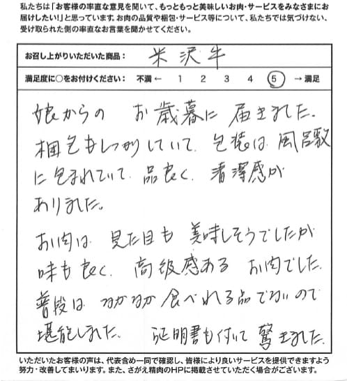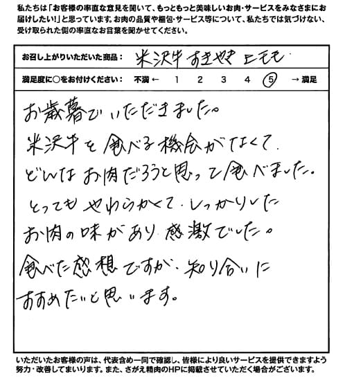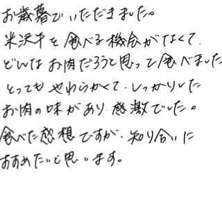 お歳暮でいただきました。 米沢牛を食べる機会がなくて、どんなお肉だろうと思って食べました。 とってもやわらかくてしっかりしたお肉の味があり、感激でした。 食べた感想ですが、知り合いにすすめたいと思います。