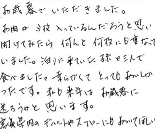 お歳暮でいただきました。 お肉が3枚入っているんだろうと思い開けてみたら、何んと何枚にも重なっていました。泊りに来ていた孫と三人で食べました。柔らかくてとってもおいしかったです。私も来年はお歳暮に送ろうかと思います。 宮城県内のデパートやスーパーにもおいてほしい!!