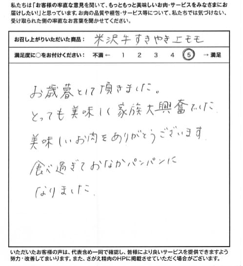 とっても美味しく家族大興奮、おなかパンパンになりました【米沢牛/すきやき 上モモ/お歳暮】