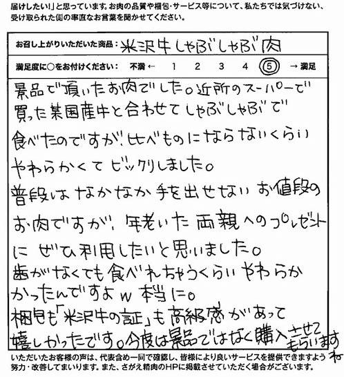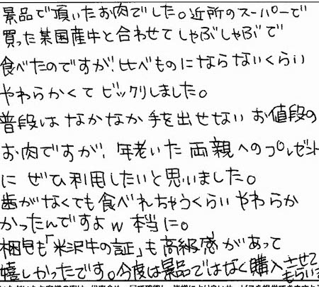 景品で頂いたお肉でした。近所のスーパーで買った某国産牛と合わせてしゃぶしゃぶで食べたのですが、比べものにならないくらいやわらかくてビックリしました。普段はなかなか手を出せないお値段のお肉ですが、年老いた両親へのプレゼントにぜひ利用したいと思いました。歯がなくても食べれちゃうくらい柔らかかったんですよw本当に。梱包も「米沢牛の証」も高級感があって嬉しかったです。今度は景品ではなく購入させてもらいますね