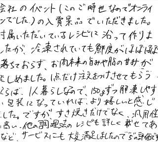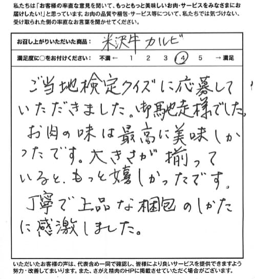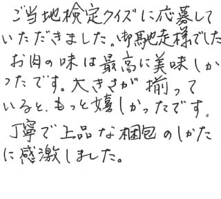 ご当地検定クイズに応募させていただきました。御馳走様でした。 お肉の味は最高に美味しかったです。大きさが揃っていると、もっと嬉しかったです。 丁寧で上品な梱包のしかたに感激しました。