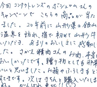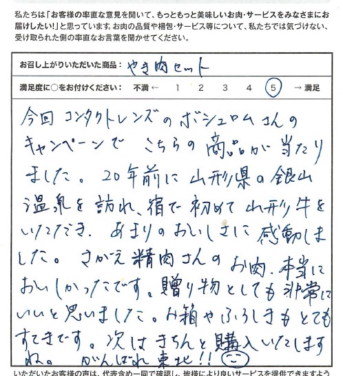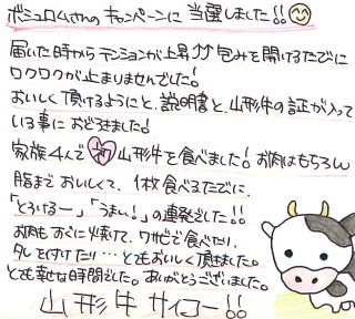 ボシュロムさんのキャンペーンに当選しました!届いた時からテンションが上昇!包みを開けるたびにワクワクが止まりませんでした!おいしく頂けるようにと説明書と、山形牛の証が入っている事におどろきました!家族4人で初山形牛を食べました!お肉はもちろん、脂までおいしくて、1枚食べるたびに「とろけるー」「うまい!」の連発でした!お肉もすぐに焼けてワサビで食べたり、タレをつけたり…とてもおいしく頂きました。とても幸せな時間でした。ありがとうございました。山形牛サイコー!