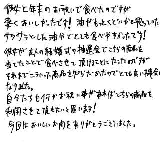 お客さまの声や口コミ・レビューをご紹介いたします。お寄せいただいた温かいお言葉を励みに、もっと、もっと、ご満足いただけるお肉をご提供できるよう努めてまいります。