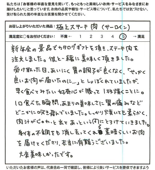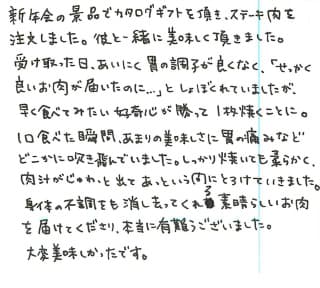 新年会の景品でカタログギフトを頂き、ステーキ肉を注文しました。彼と一緒に美味しく頂きました。受け取った日、あいにく胃の調子が良くなく、「せっかく良いお肉が届いたのに…」としょぼくれていましたが、早く食べてみたい好奇心が勝って1枚焼くことに。1口食べた瞬間、あまりの美味しさに胃の痛みなどどこかに吹き飛んでいました。しっかり焼いても柔らかく、肉汁がじゅわっと出てあっという間にとろけていきました。身体の不調をも消し去ってくれる素晴らしいお肉を届けてくださり、本当に有難うございました。大変美味しかったです。