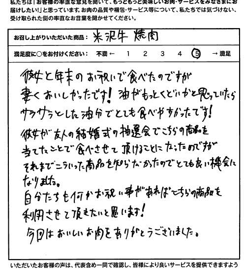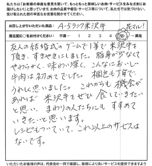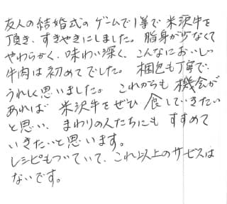 友人の結婚式のゲームで1等で米沢牛を頂き、すきやきにしました。脂身が少なくてやわらかく、味わい深く、こんなにおいしい牛肉は初めてでした。梱包も丁寧でうれしく思いました。これからも機会があれば米沢牛をぜひ食していきたいと思い、まわりの人たちにもすすめていきたいと思います。レシピもついていて、これ以上のサービスはないです。