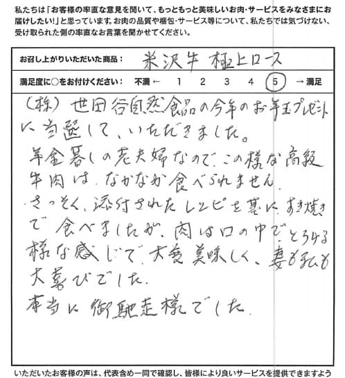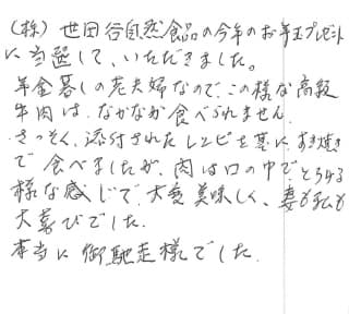 (株)世田谷自然食品の今年のお年玉プレゼントに当選して、いただきました。年金暮らしの老夫婦なので、この様な高級牛肉は、なかなか食べられません。さっそく、添付されたレシピを基に、すき焼きで食べましたが、肉は口の中で、とろける様な感じで、大変美味しく、妻も私も大喜びでした。本当に御馳走様でした。