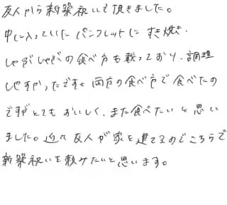 友人から新築祝いで頂きました。 中に入っていたパンフレットにすき焼き、しゃぶしゃぶの食べ方も載っており、調理しやすかったです。両方の食べ方で食べたのですがとてもおいしく、また食べたいと思いました。近々友人が家を建てるのでこちらで新築祝いを頼みたいと思います。