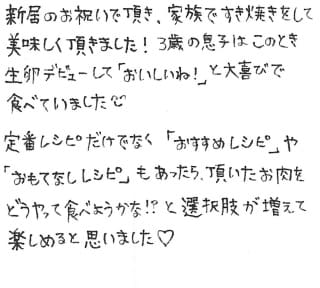 新居のお祝いで頂き、家族ですき焼きをして美味しく頂きました!3歳の息子はこのとき生卵デビューして「おいしいね!」と大喜びで食べていました。 定番レシピだけでなく「おすすめレシピ」や「おもてなしレシピ」もあったら、頂いたお肉をどうやって食べようかな!?と選択肢が増えて楽しめると思いました。
