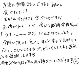 友達に新築祝いで頂き初めて食べました!!! もちろんすき焼きで食べたのですが、お肉がトロトロで、食べた瞬間家族皆んな「うま〜〜♡♡」が止まりませんでした。 今回は頂いて食べてすごく幸せな気持ちになり、こんなステキなプレゼントをしてくれた友達にも感謝してます♡ 今後も何かの祝い事の時に頼ませていただきます。