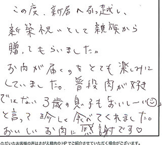 この度、新居へ引っ越し、新築祝いとして親族から贈ってもらいました。お肉が届くのをとても楽しみにしていました。普段肉が好きではない3歳の息子も「おいしーい(・v・)」と言って珍しく食べてくれました。おいしいお肉に感謝です♡