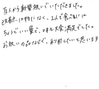 友人から新築祝いでいただきました。改善点は特になく、2人で食べるにはちょうどいい量で、味も大変満足でした。お祝いの品などで、利用したいと思います。