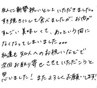 友人に新築祝いとしていただきました。すき焼きにして食べましたが、お肉がすんごい美味しくて、あっという間になくなってしまいました…私達も知人へのお祝いなどで次回お取り寄せさせていただこうと思いました!またよろしくお願いします!
