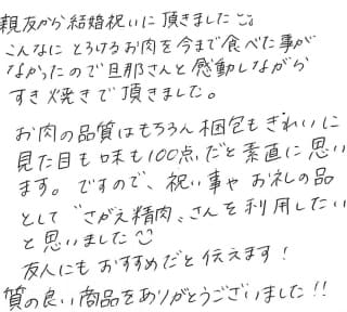 親友から結婚祝いに頂きました。 こんなにとろけるお肉を今まで食べた事がなかったので旦那さんと感動しながらすき焼きで頂きました。 お肉の品質はもちろん梱包もきれいに見た目も味も100点だと素直に思います。ですので、祝い事やお礼の品として"さがえ精肉"さんを利用したいと思いました。 友人にもおすすめだと伝えます! 質の良い商品をありがとうございました!!