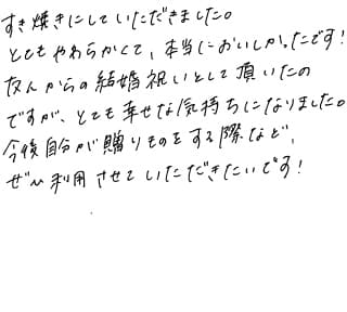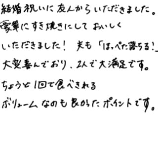 すき焼きにしていただきました。 とてもやわらかくて、本当においしかったです! 友人からの結婚祝いとして頂いたのですが、とても幸せな気持ちになりました。 今後自分が贈りものをする際など、ぜひ利用させていただきたいです!