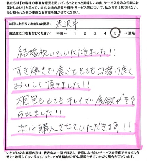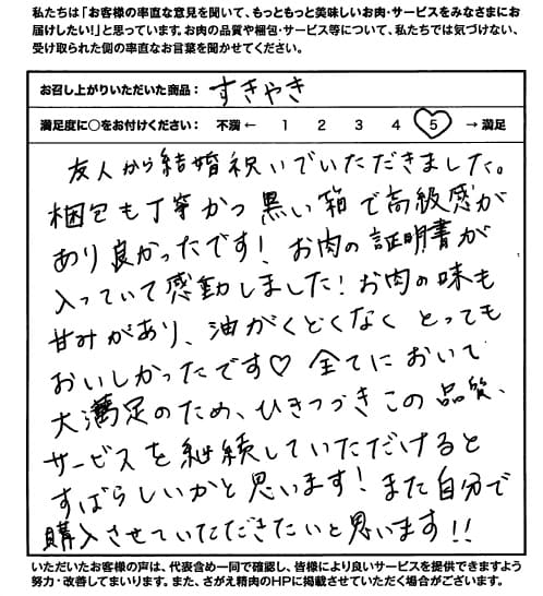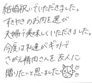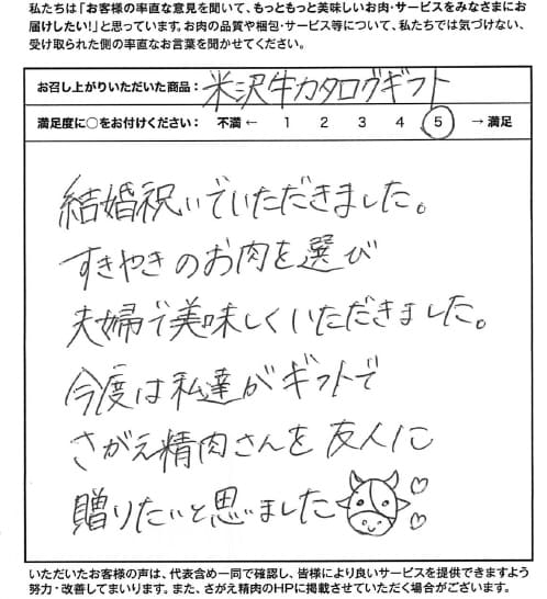 結婚祝いでいただきました。 すきやきのお肉を選び、夫婦で美味しくいただきました。 今度は私たちがギフトでさがえ精肉さんの友人に贈りたいと思いました🐮