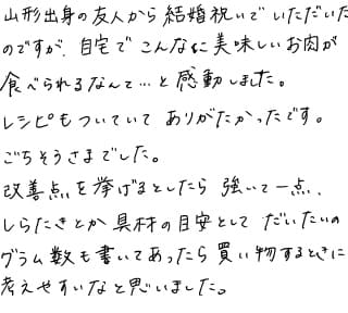山形出身の友人から結婚祝いでいただいたのですが、自宅でこんなに美味しいお肉が食べられるなんて... と感動しました。 レシピもついていてありがたかったです。 ごちそうさまでした。 改善点を挙げるとしたら強いて一点、しらたきとか具材の目安としてだいたいのグラム数も書いてあったら買い物するときに考えやすいなと思いました。