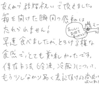友人から結婚祝いで頂きました。 箱を開けた瞬間の感動は忘れられません! 早速食べましたがとろける様な食感で、とても美味しかったです。 保存方法(冷凍、冷蔵)について、もう少し分かり易く表記頂けると尚良いと思いました。