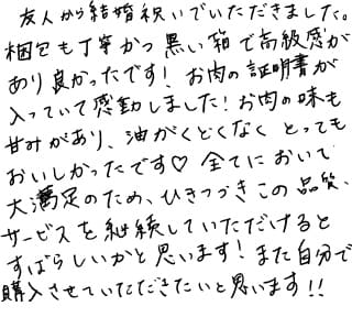 友人から結婚祝いでいただきました。梱包も丁寧かつ黒い箱で高級感があり良かったです!お肉の証明書が入っていて感動しました!お肉の味も甘味があり、油がくどくなくとってもおいしかったです♡全てにおいて大満足のため、ひきつづきこの品質、サービスを継続していただけると素晴らしいかと思います!また自分で購入させていただきたいと思います!!