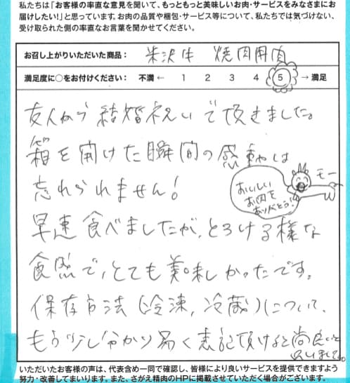 お客さまの声や口コミ・レビューをご紹介いたします。お寄せいただいた温かいお言葉を励みに、もっと、もっと、ご満足いただけるお肉をご提供できるよう努めてまいります。